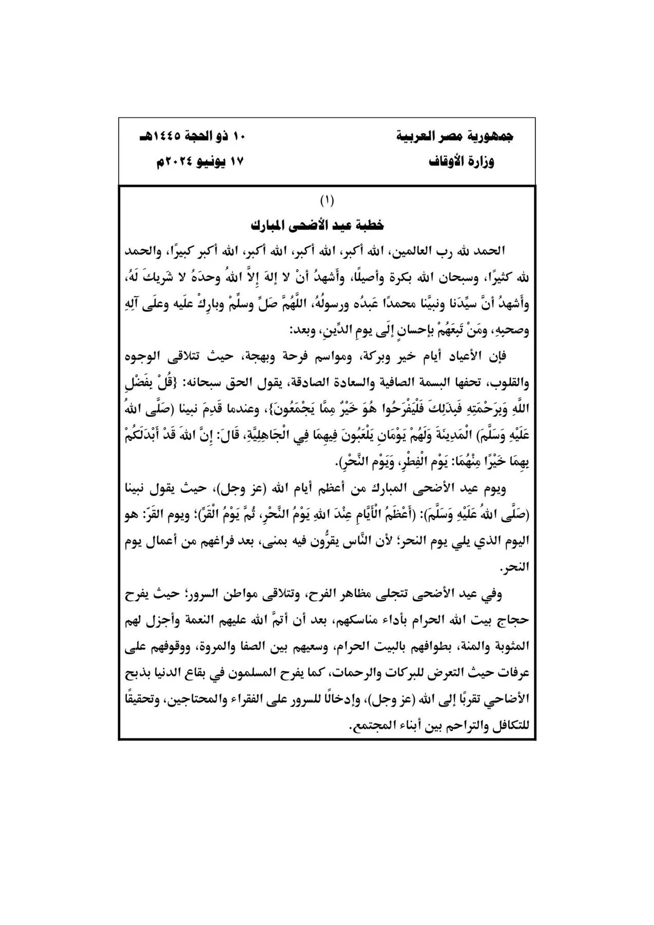 يهتم كثيرون بمعرفة موضوع وتفاصيل خطبة عيد الأضحى قصيرة pdf سواء المرتقبة في المساجد التابعة لوزارة الأوقاف عقب صلاة العيد، أو تلك التي يستعان بها في معرفة فضل يوم النحر والأعمال التي يجب أن يفعلها المسلم فيه إن عزم على الأضحية، أو لم يكن مقتدرًا عليها، لذلك يعرض القاهرة 24 نموذجين من خطبة عيد الأضحى قصيرة pdf أحدهما نص الخطبة التابعة لوزارة الأوقاف، والأخرى استرشادية.