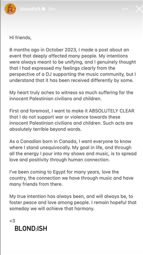 وخلال الساعات الماضية، قالت بلونديش، في بيان صحفي لها على إنستجرام: منذ 8 أشهر في أكتوبر 2023، كتبت عن حدث أثر في حياة العديد من البشر، وتوقعت أنني أوصلت مشاعري بطريقة واضحة من منظور DJ تدعم الموسيقى، لكنني تفهمت أنها وصلت بطريقة خاطئة للبعض.
