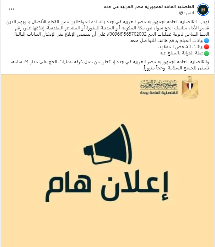إحاطة هامة من القنصلية المصرية بجدة بشأن فقدان الاتصال بالحجاج