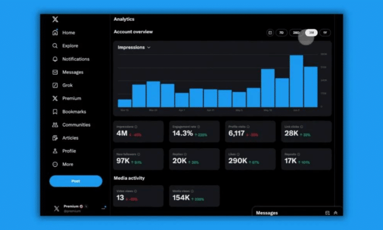 طرحت منصة إكس ميزة تحليلات الحساب المتقدمة، وأصبح بمقدور مشتركي X Premium الآن، الوصول إلى رؤى محددة بخصوص الأداء، مع بيانات بخصوص إجمالي مرات الظهور، ومعدل التفاعل، وزيارات الحساب، وأداء الفيديو، ونقرات الارتباط وغيرها.