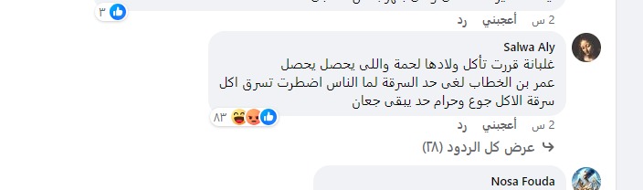 وكتبت سلوى محمد علي، تعليقًا على منشور الفنانة عارفة عبد الرسول، الذي ذكرت خلاله تفاصيل واقعة السرقة، قائلة: غلبانة قررت تأكل ولادها لحمة واللي يحصل يحصل، عمر بن الخطاب لغى حد السرقة، لما الناس اضطرت تسرق أكل، سرقة الأكل جوع.. وحرام حد يبقى جعان.