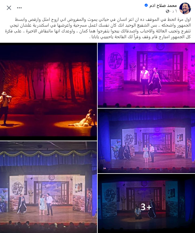 وكتب محمد صلاح آدم منشورًا، عبر حسابه الشخصي بموقع التواصل الاجتماعي فيس بوك، قال فيه: أول مرة أتحط في الموقف ده إن أعز إنسان في حياتي يموت، والمفروض أني أروح أمثل وأرقص وأبسط الجمهور وأضحكه.. بس الشفيع الوحيد إنك كان نفسك أعمل مسرحية، وأعرضها في إسكندرية علشان تيجي تتفرج وتجيب العائلة والأحباب، وأصدقاءك ييجوا يتفرجوا هما كمان.. وأوعدك إنها ماتبقاش الأخيرة على فكرة كل الجمهور إمبارح قام وقف وقرأ لك الفاتحة يا حبيبي يا بابا.
