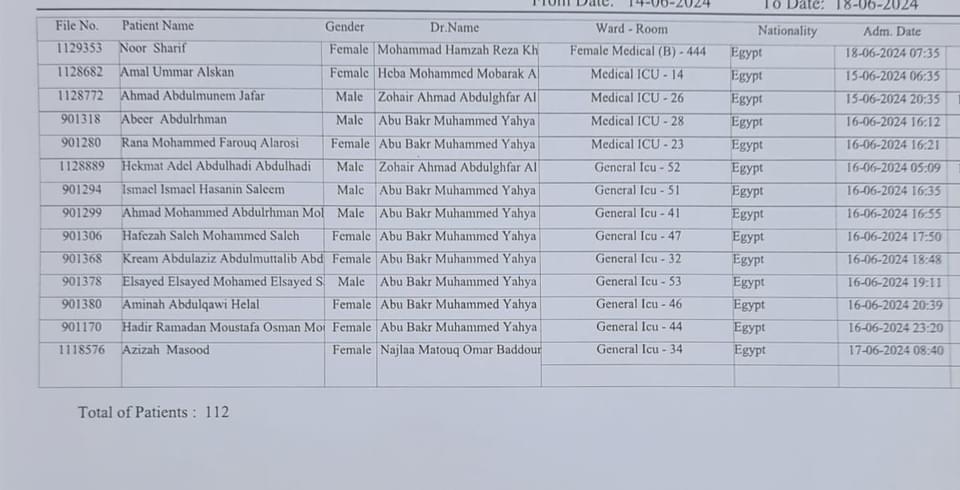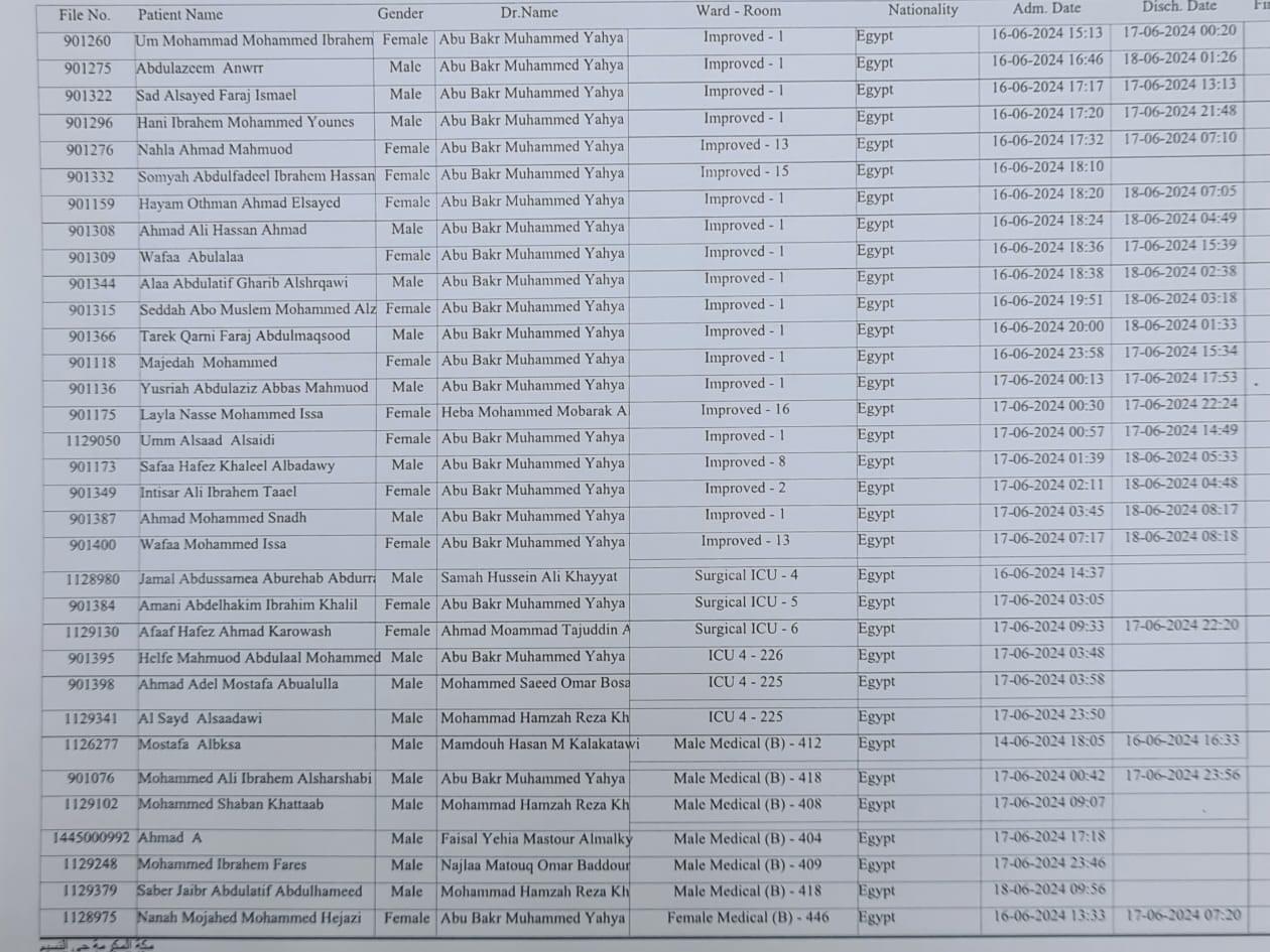 حصل القاهرة 24 على أسماء المرضى المصريين المحتجزين بمستشفى النور في مكة المكرمة، بالمملكة العربية السعودية، في أثناء أداء مناسك موسم الحج 2024.