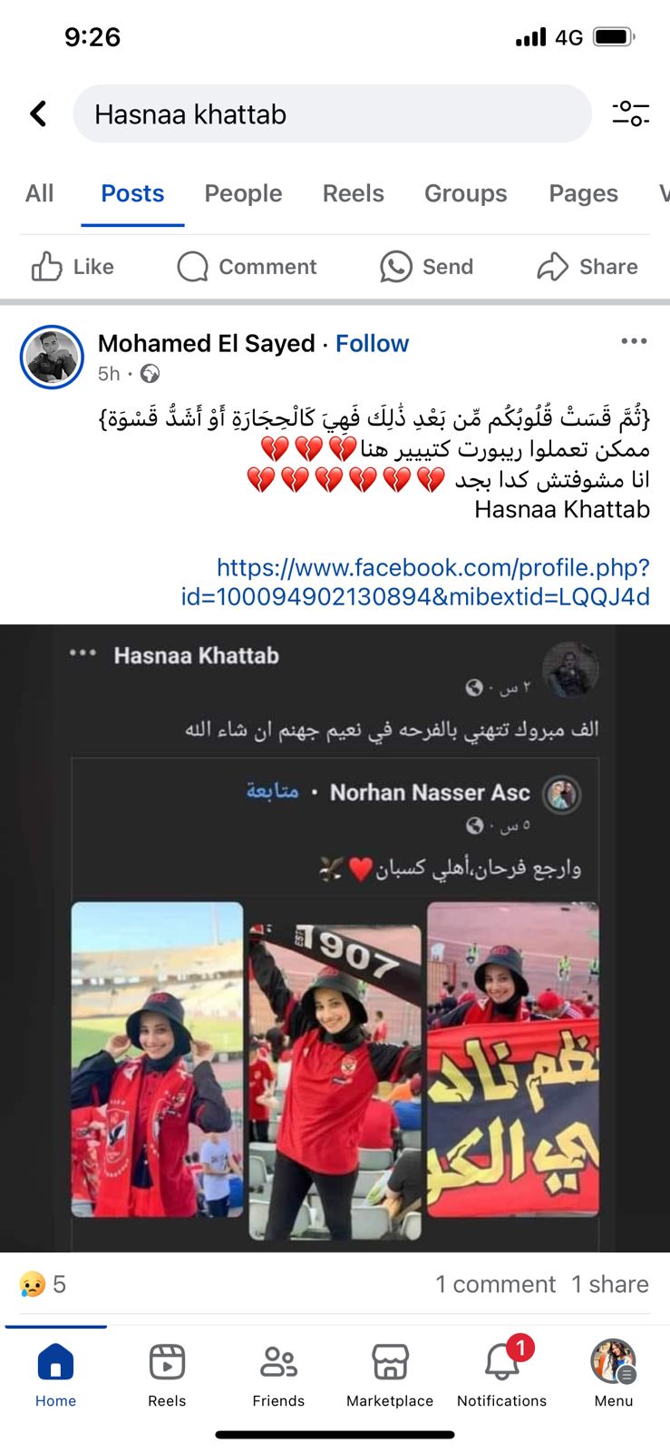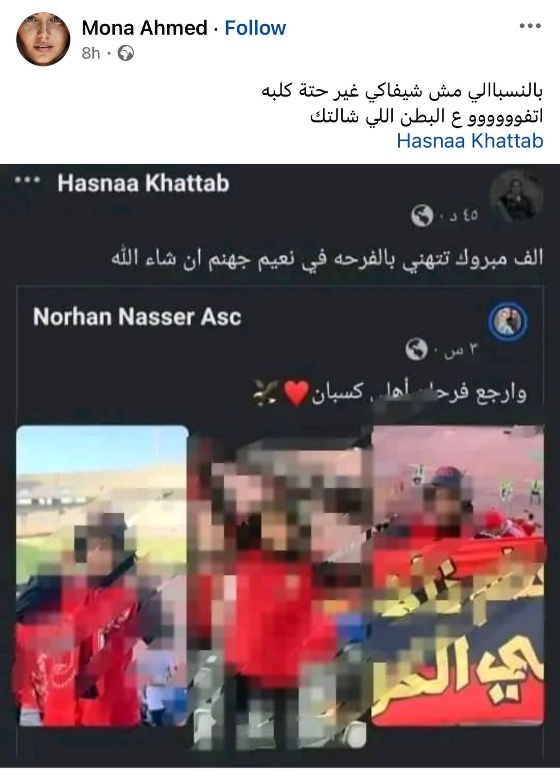 وشاركت فتاة من حساب بـ اسم حسناء خطاب، بأحد المنشورات على منصة التواصل الاجتماعي فيسبوك، معلقة على وفاة نورهان ناصر مشجعة الأهلي: ألف مبروك تتهني بالفرحة في نعيم جهنم إن شاء الله.