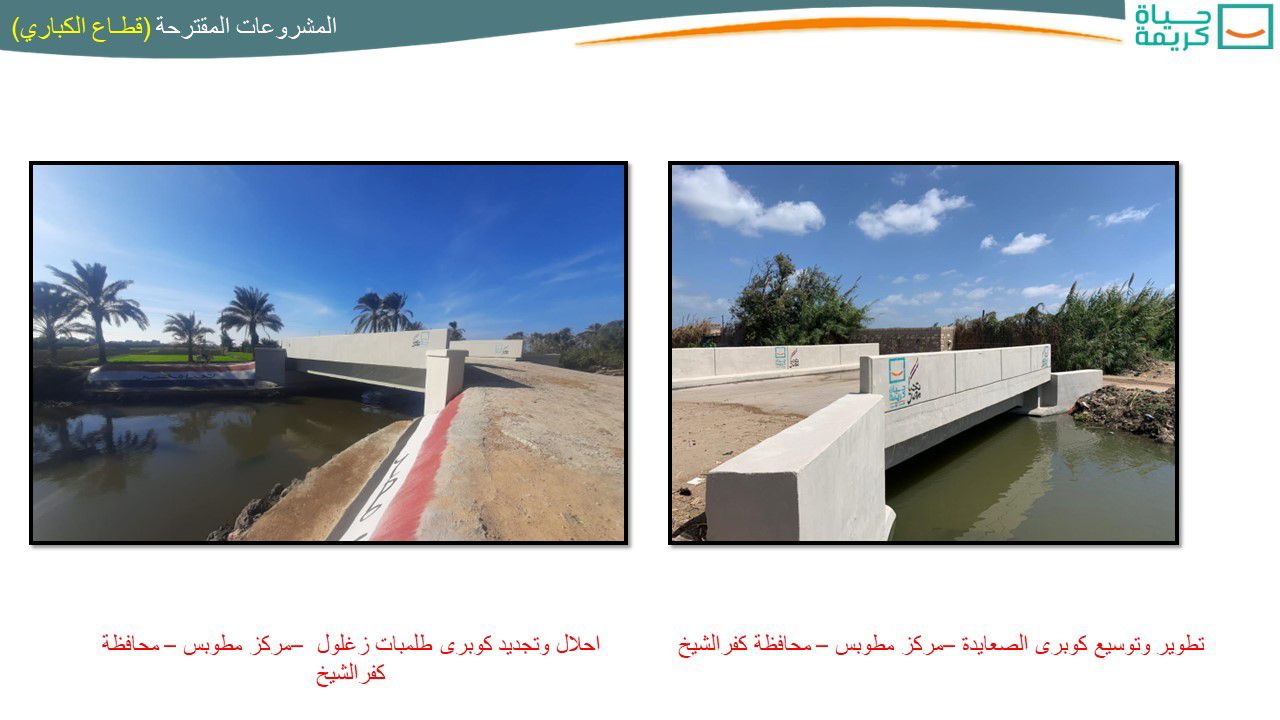 وذكر اللواء مختار حسين، رئيس جهاز تعمير الساحل الشمالي الأوسط، أنه تم الانتهاء من إنشاء وتطوير 27 وحدة إسعاف، و45 مشروع إنشاء ورفع كفاءة لوحدات صحية ومراكز طبية، من إجمالى 67 مشروعًا، طبقًا لمنظومة التأمين الصحي الشامل، بجانب إنشاء مستشفى مركزي بمركز مطوبس، كما تم الانتهاء من 54 كوبرى ري إنشاء - إحلال وتجديد - تطوير وتوسيع، بالتنسيق مع المختصين من وزارة الرى بما يحقق تنفيذ الأعمال المطلوبة وعدم تأثر المجارى المائية بهذه الأعمال، وتحقق الكبارى الربط المطلوب بين أجزاء القرية الواحدة وبين القرى وبعضها.