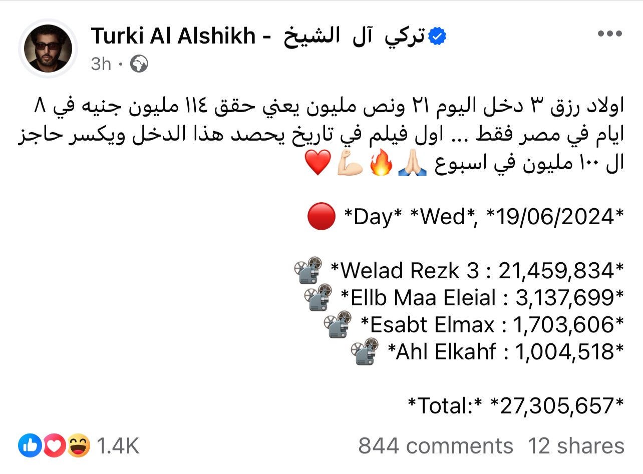 وكتب تركي آل الشيخ، منشورًا عبر حسابه الشخصي بموقع التواصل الاجتماعي فيسبوك، قال فيه: ولاد رزق 3 دخل اليوم 21 ونص مليون يعني حقق 114 مليون جنيه في 8 أيام في مصر فقط، أول فيلم في التاريخ يحصد هذا الدخل ويكسر حاجز الـ 100 مليون في أسبوع.