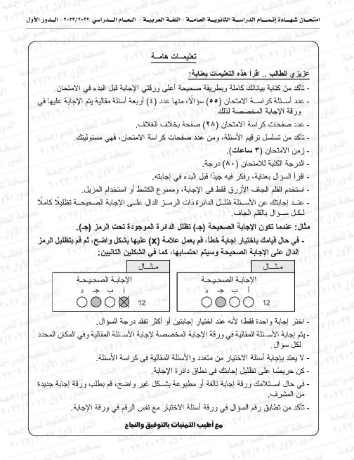 نموذج استرشادي لامتحان اللغة العربية للثانوية العامة 2024 pdf.. آخر بروفة للطلاب