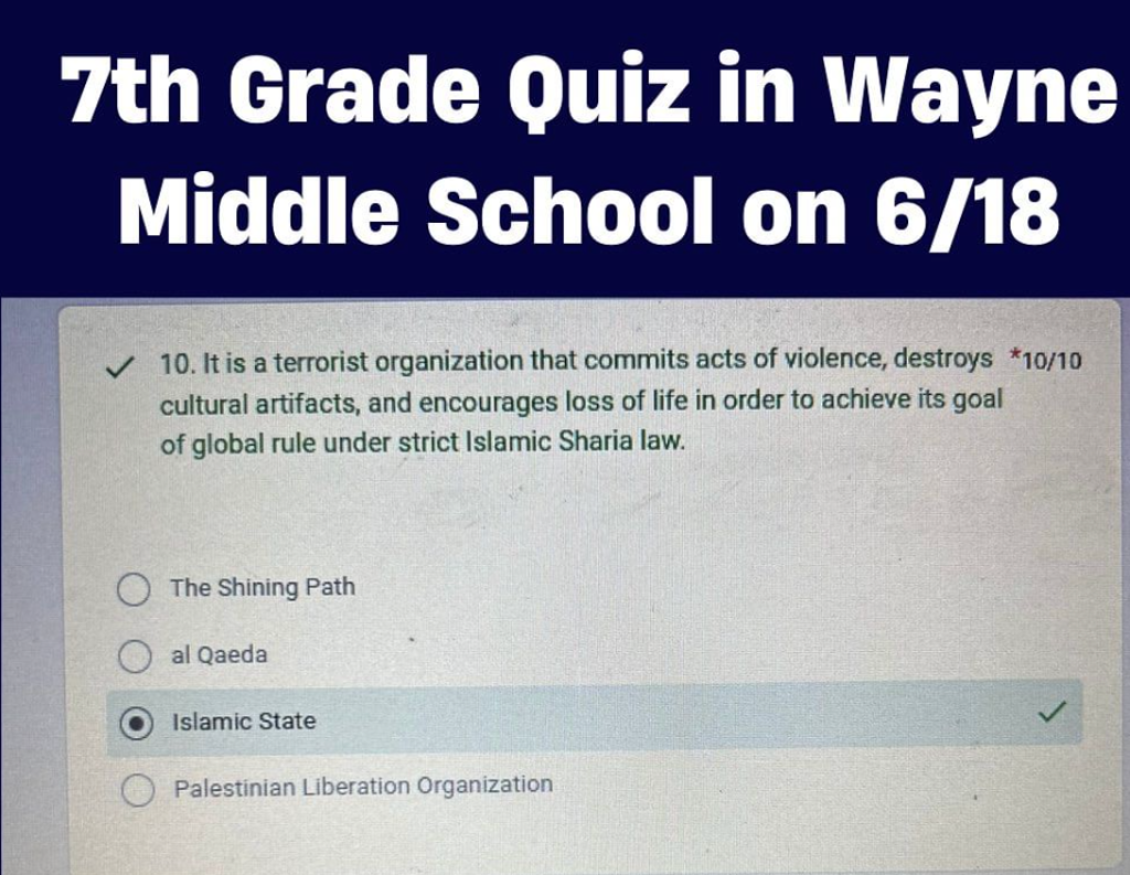 والسؤال الذي وجه للطلاب جاء كالتالي، إنها منظمة إرهابية ترتكب أعمال عنف، وتدمر التحف الثقافية، وتشجع على فقدان الأرواح من أجل تحقيق هدفها المتمثل في الحكم العالمي بموجب الشريعة الإسلامية الصارمة، وطلب من الطلاب اختيار المجموعة من بين الخيارات المتعددة أدناه، التي تضمنت الدرب المضيء، والقاعدة والدولة الإسلامية، ومنظمة التحرير الفلسطينية.