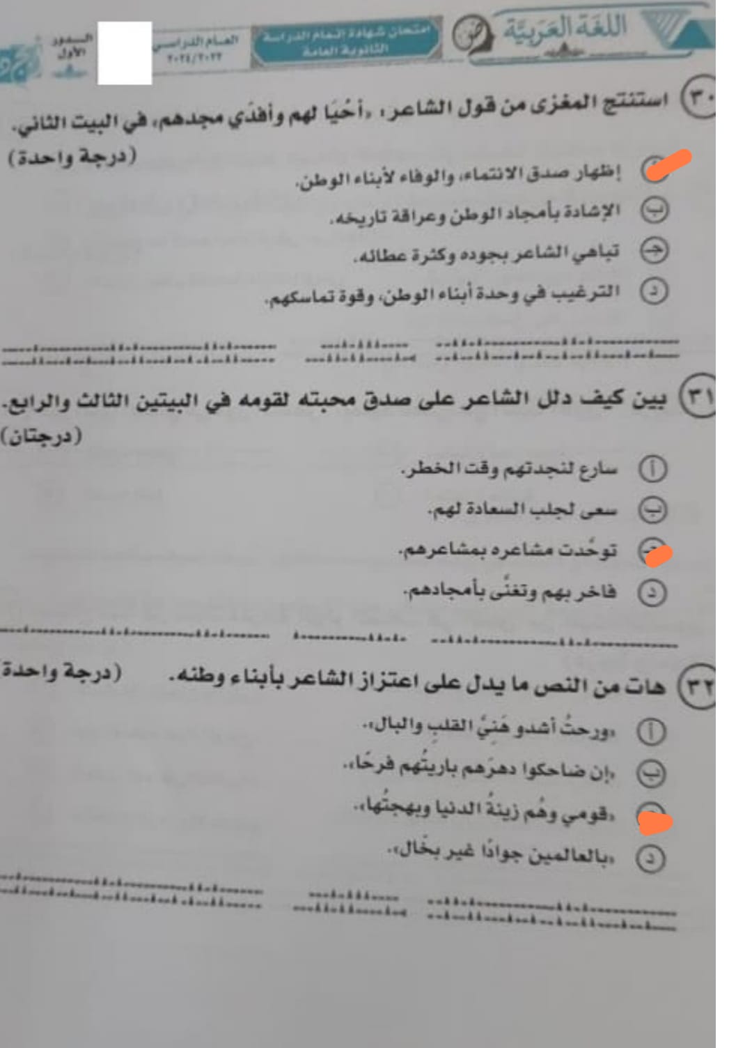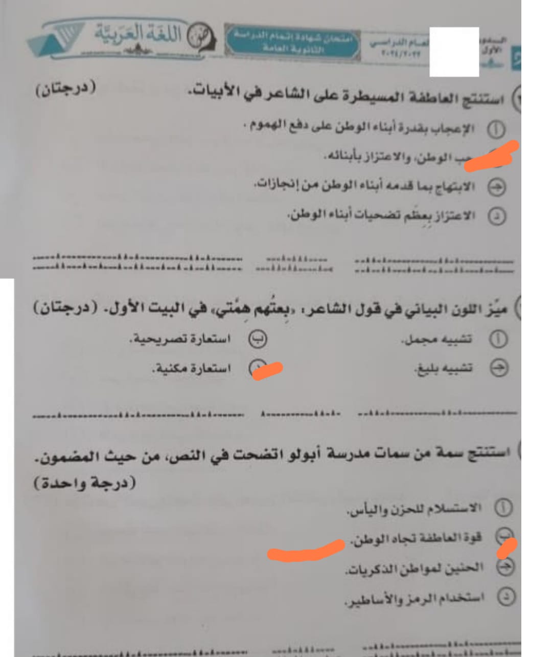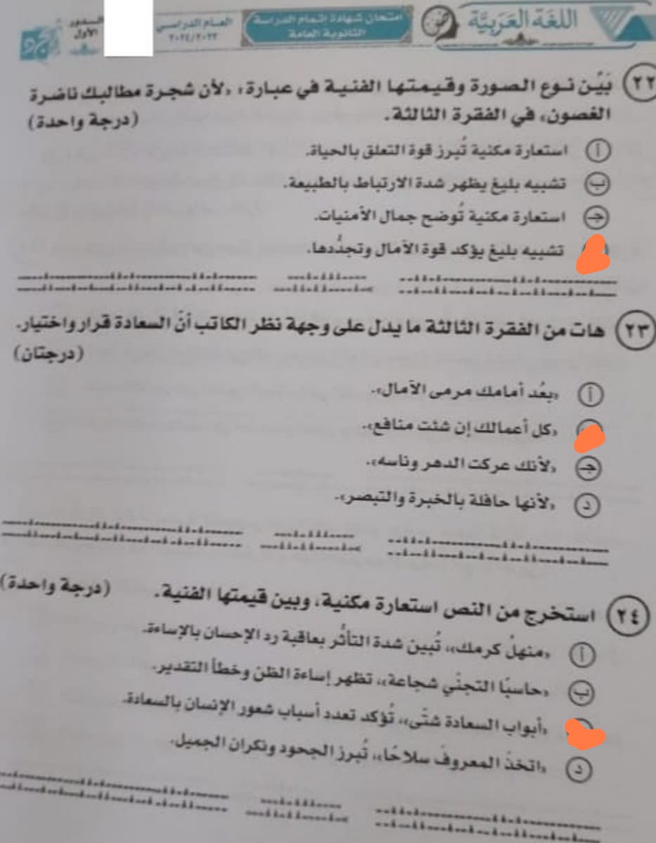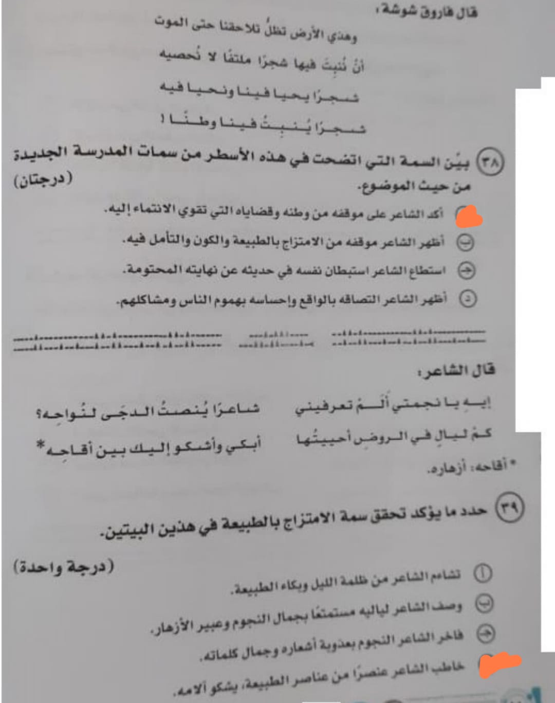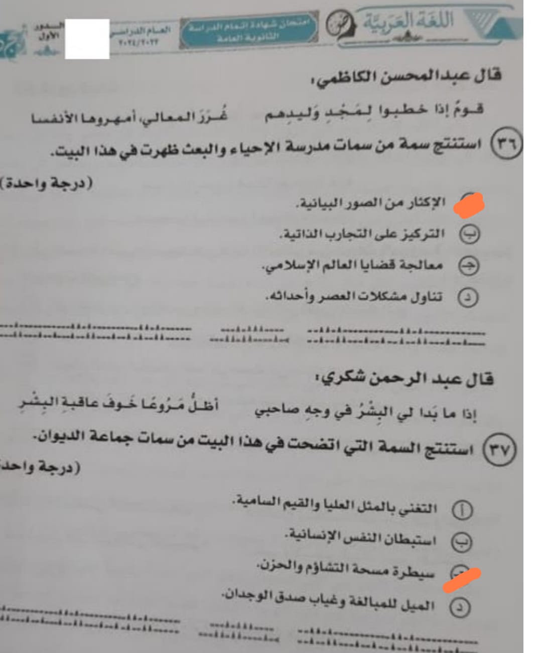 وجاءت إجابات أسئلة العربي لطلاب الثانوية العامة كالآتي: