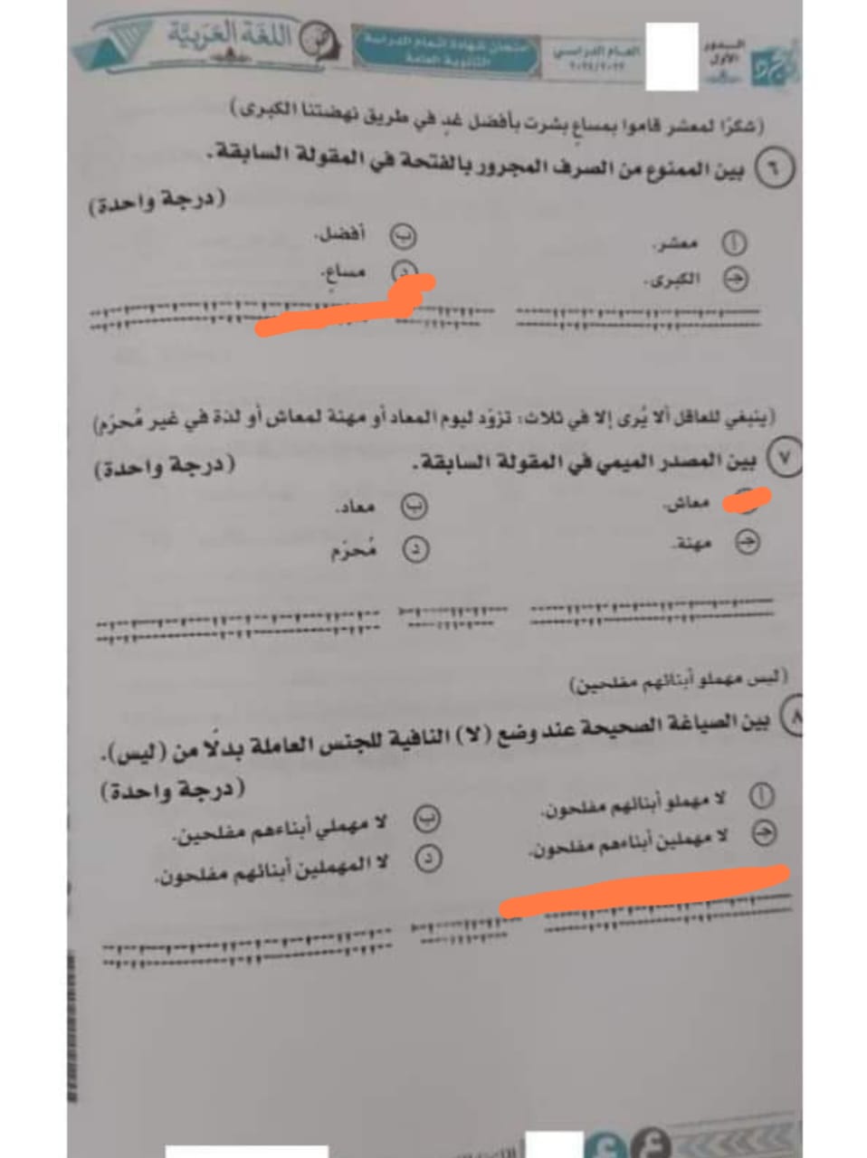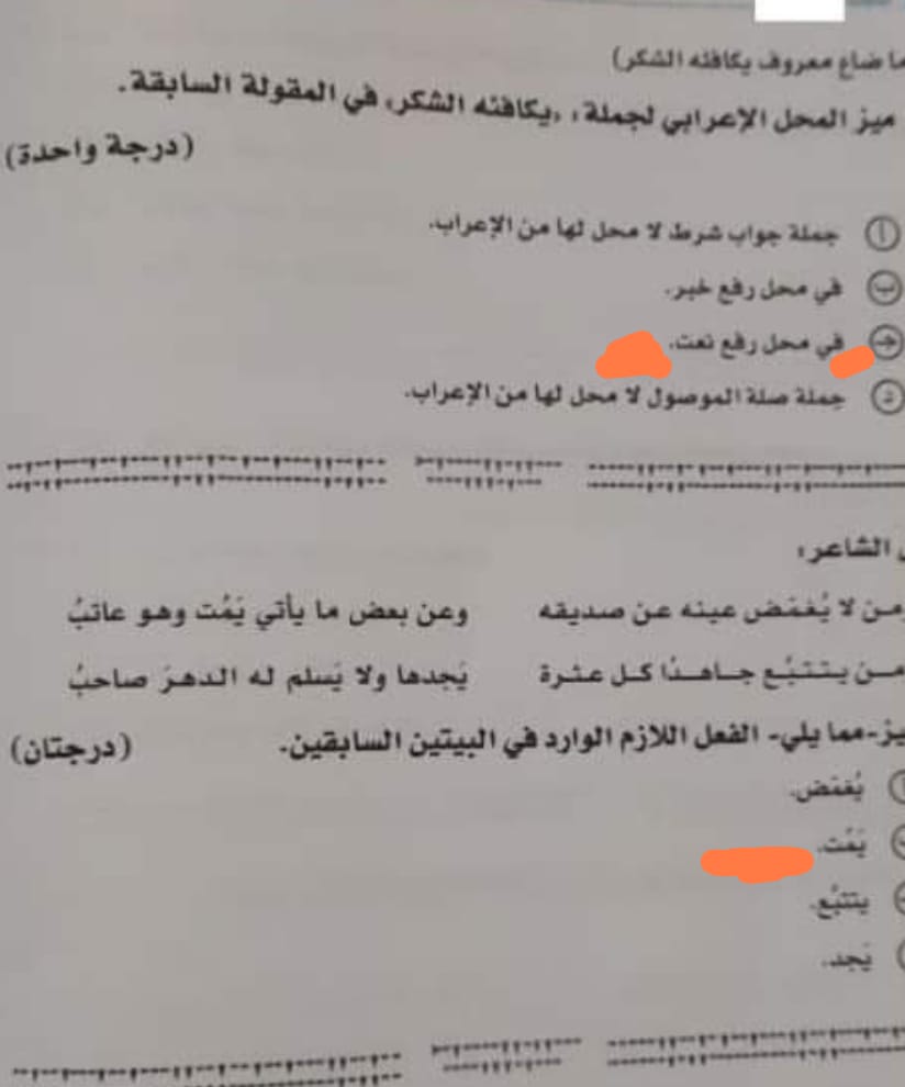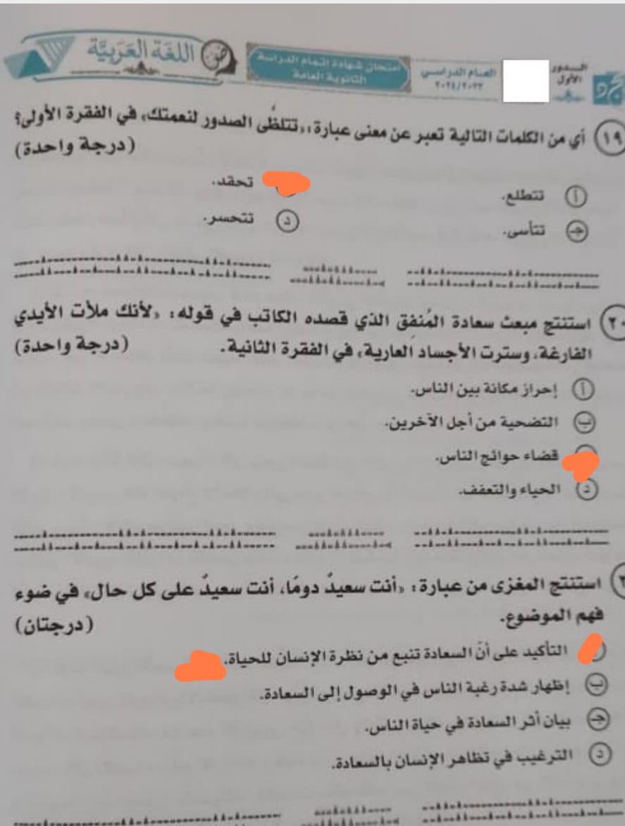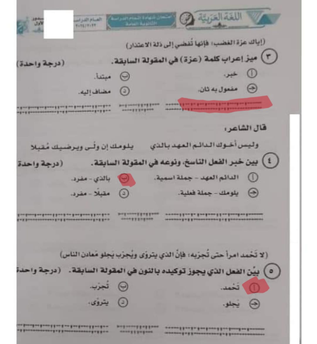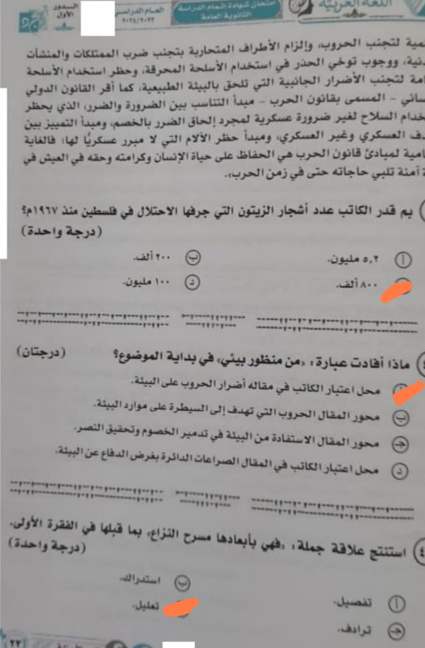 وجاءت إجابات أسئلة العربي لطلاب الثانوية العامة كالآتي: