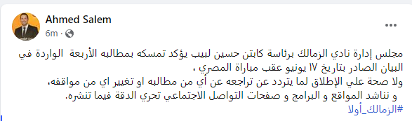 وكتب أحمد سالم عبر صفحته الرسمية على فيسبوك: مجلس إدارة نادي الزمالك برئاسة كابتن حسين لبيب، يؤكد تمسكه بمطالبه الأربعة الواردة في البيان الصادر بتاريخ 17 يونيو عقب مباراة المصري، ولا صحة على الإطلاق لما يتردد عن تراجعه عن أي من مطالبه أو تغيير أي من مواقفه، ونناشد المواقع والبرامج وصفحات التواصل الاجتماعي تحري الدقة فيما تنشره.
