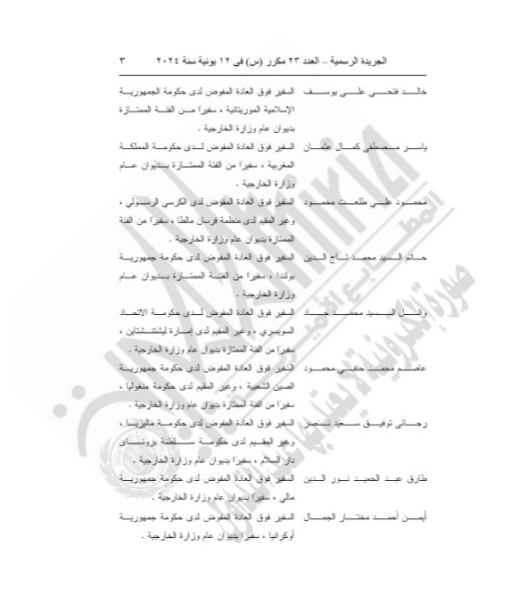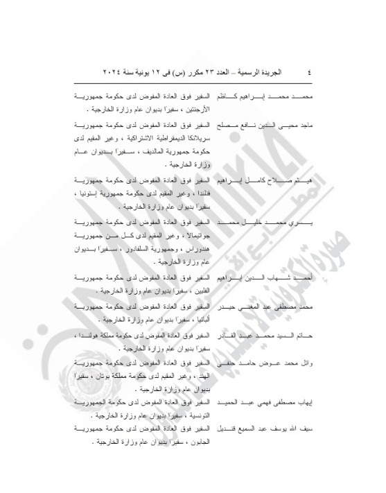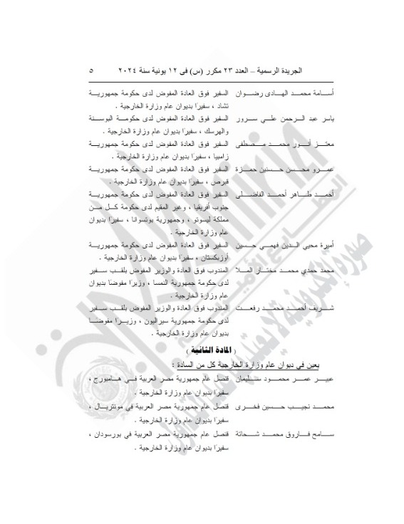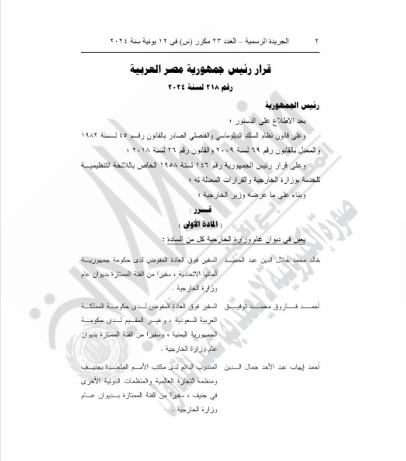نشرت الجريدة الرسمية تصديق الرئيس عبد الفتاح السيسي رئيس الجمهورية على القرار رقم 218 لسنة 2024، الخاص بالحركة الدبلوماسية لوزارة الخارجية.