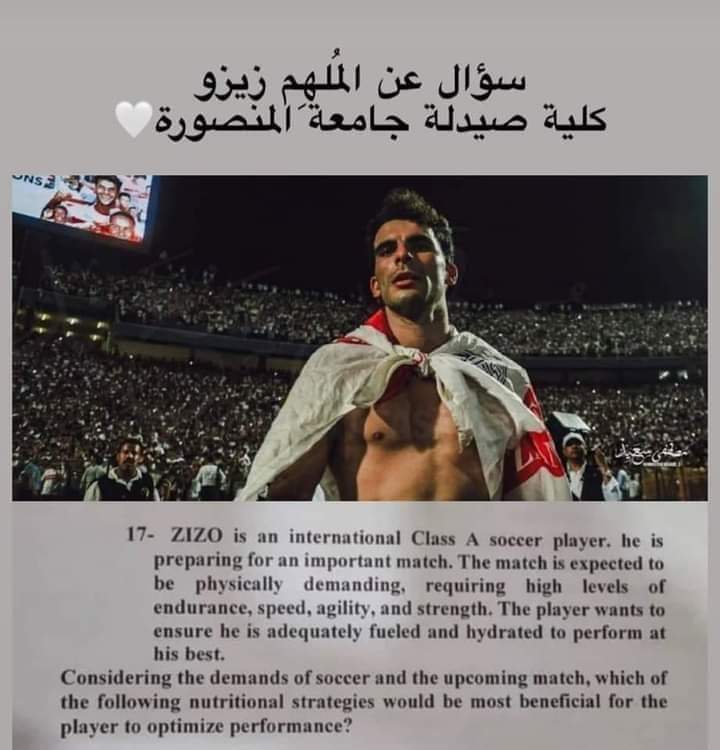 وجاء نص السؤال كالتالي: زيزو لاعب كرة قدم دولي من الدرجة الأولى، إنه يستعد لمباراة مهمة، ومن المتوقع المباراة بها مجهود بدني وتتطلب مستويات عالية من التحمل والسرعة وخفة الحركة والقوة.. يريد اللاعب التأكد من حصوله على ما يكفي من الوقود والرطوبة لأداء أفضل لديه.. بالنظر إلى متطلبات كرة القدم والمباراة المقبلة، أي من الاستراتيجيات الغذائية التالية ستكون أكثر فائدة للاعب لتحسين الأداء؟
