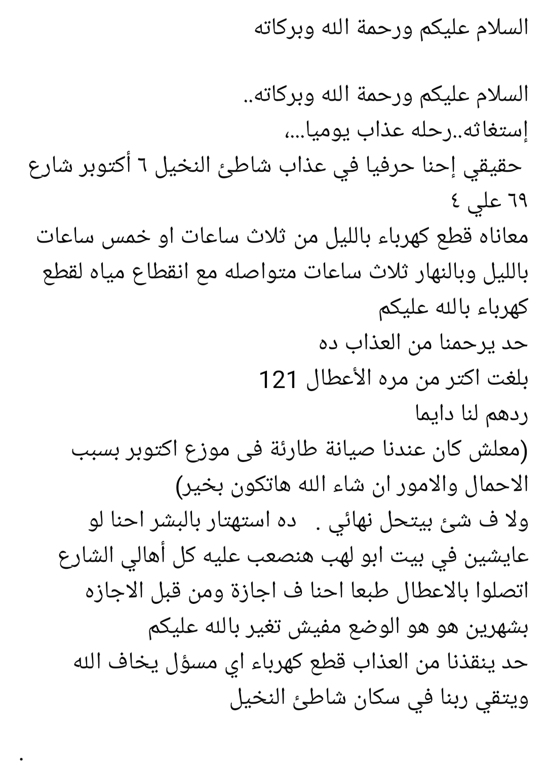 كما قالت صابرين. س؛ من سكان قرية النخيل شارع 64/4، إن الأزمة في تعطل المحولات الكهربية بالمنطقة وتلفها نتيجة زيادة الأحمال من المنطقة الشاطئية، مشيرة إلى تضرر سكان القرية بالكامل من طول ساعات انقطاع الكهرباء والمياه أيضا، مشيرة إلى أنها تواصلت مع طوارئ الكهرباء وأخبروها بوجود عطل في محولات الكهرباء.