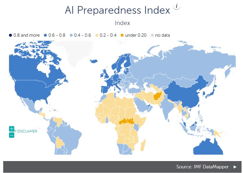 وتميل الاقتصادات الأكثر ثراءً إلى أن تكون مجهزة بشكل أفضل لتبني الذكاء الاصطناعي مقارنة بالدول منخفضة الدخل.