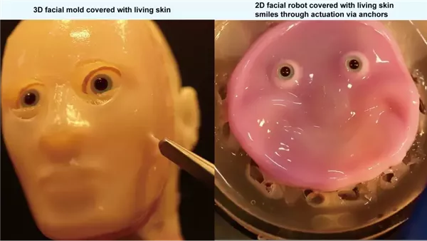 وتم ربط الجلد المزروع في المختبر بوجه روبوتي بسيط وصغير قادر على الابتسام، ويمكن للأنسجة أن تشفي نفسها بنفسها، وتم دمج الوظائف الحسية مثل اكتشاف اللمس ودرجة الحرارة أكثر جدوى مع الأنسجة الحية.