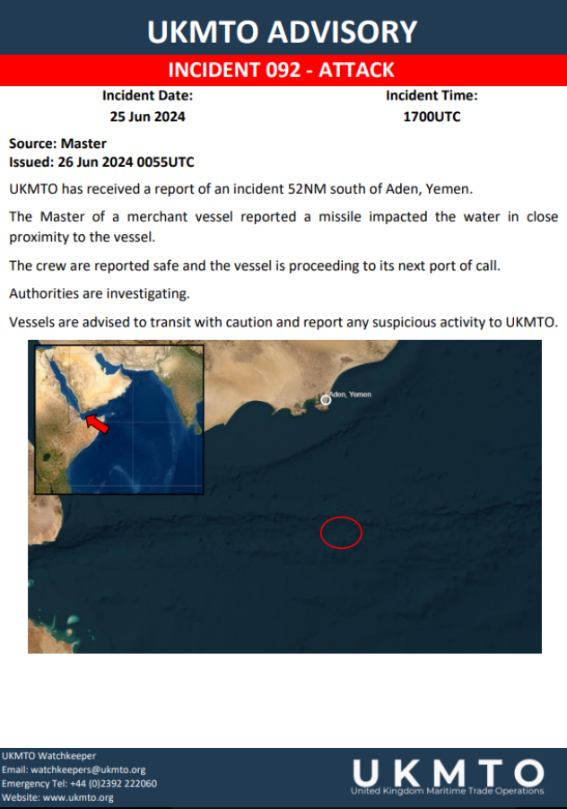 أفادت هيئة عمليات التجارة البحرية البريطانية، عبر تدوينة لها عبر صفحتها الرسمية على موقع إكس، بأنها تلقت بلاغا من ربان سفينة تجارية عن سقوط صاروخ في الماء بالقرب منه، وأن الحادث وقع على بعد 52 ميلا بحريا جنوبي عدن باليمن.