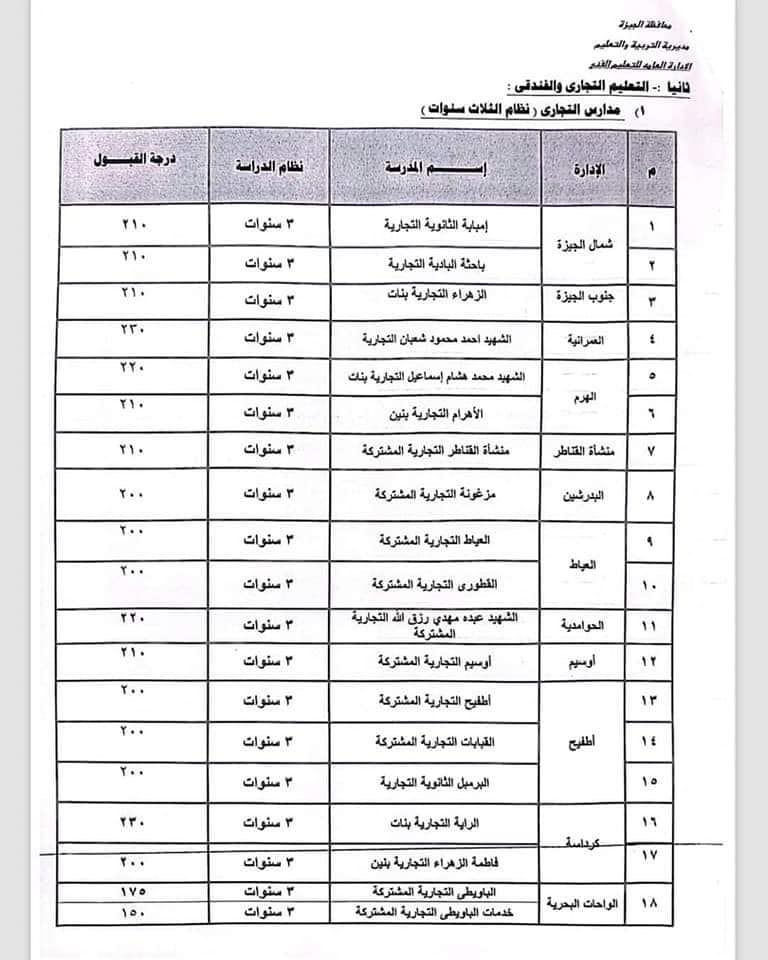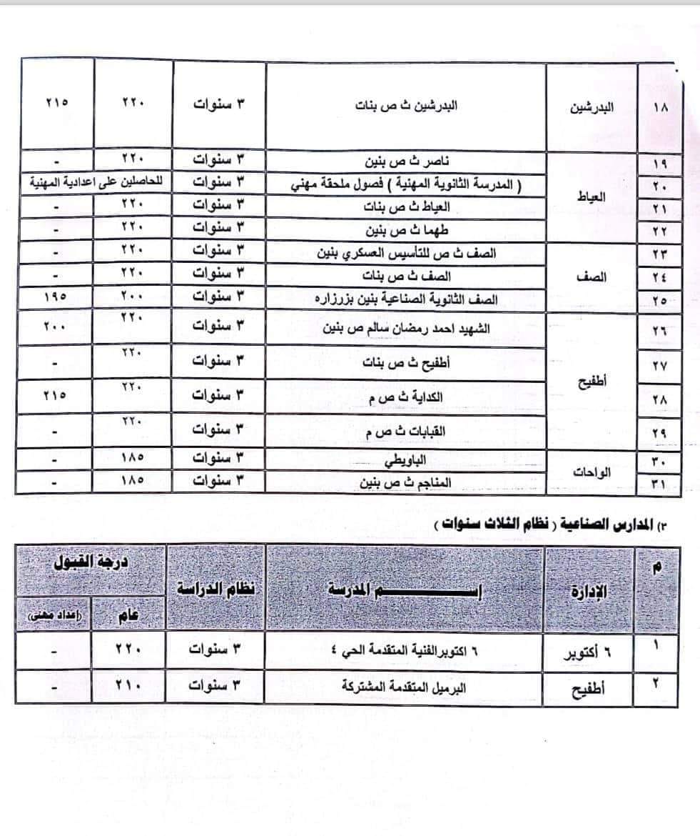 وحدد محافظ الجيزة التنسيق لـ المنوات ثانوي صناعي بنات 220 درجة، الحوامدية ثانوي صناعي بنات، شهيد طيار محمد بهجت شقير بنين للتأسيس العسكري وإعداد مهني 215 درجة، البدرشين ثانوي صناعي بنات وإعداد مهني 215 درجة.