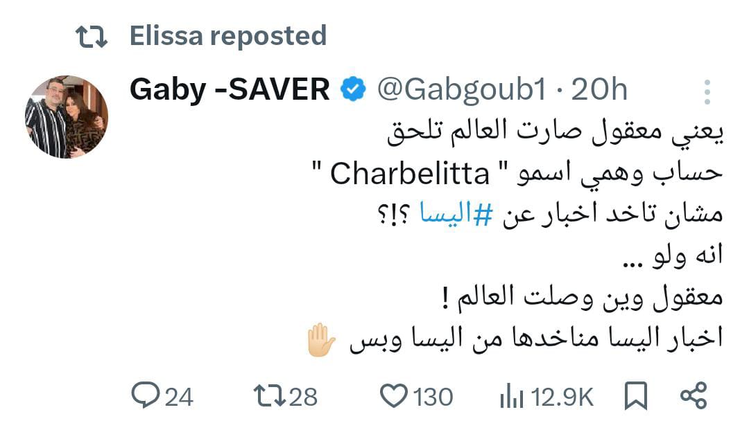 وحسمت إليسا الجدل، وأعادت نشر تدوينة عبر موقع التدوينات القصيرة X تويتر سابقًا، لأحد معجبيها قال خلالها: يعني معقول العالم بتلحق حساب وهمي علشان تاخد أخبار عن إليسا؟ معقول وين وصل العالم؟ أخبار إليسا بناخدها من إليسا وبس.