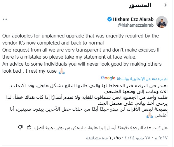 العودة خلال ساعات.. هشام عز العرب يعتذر لعملائه بسبب تعطل خدمات بنك CIB