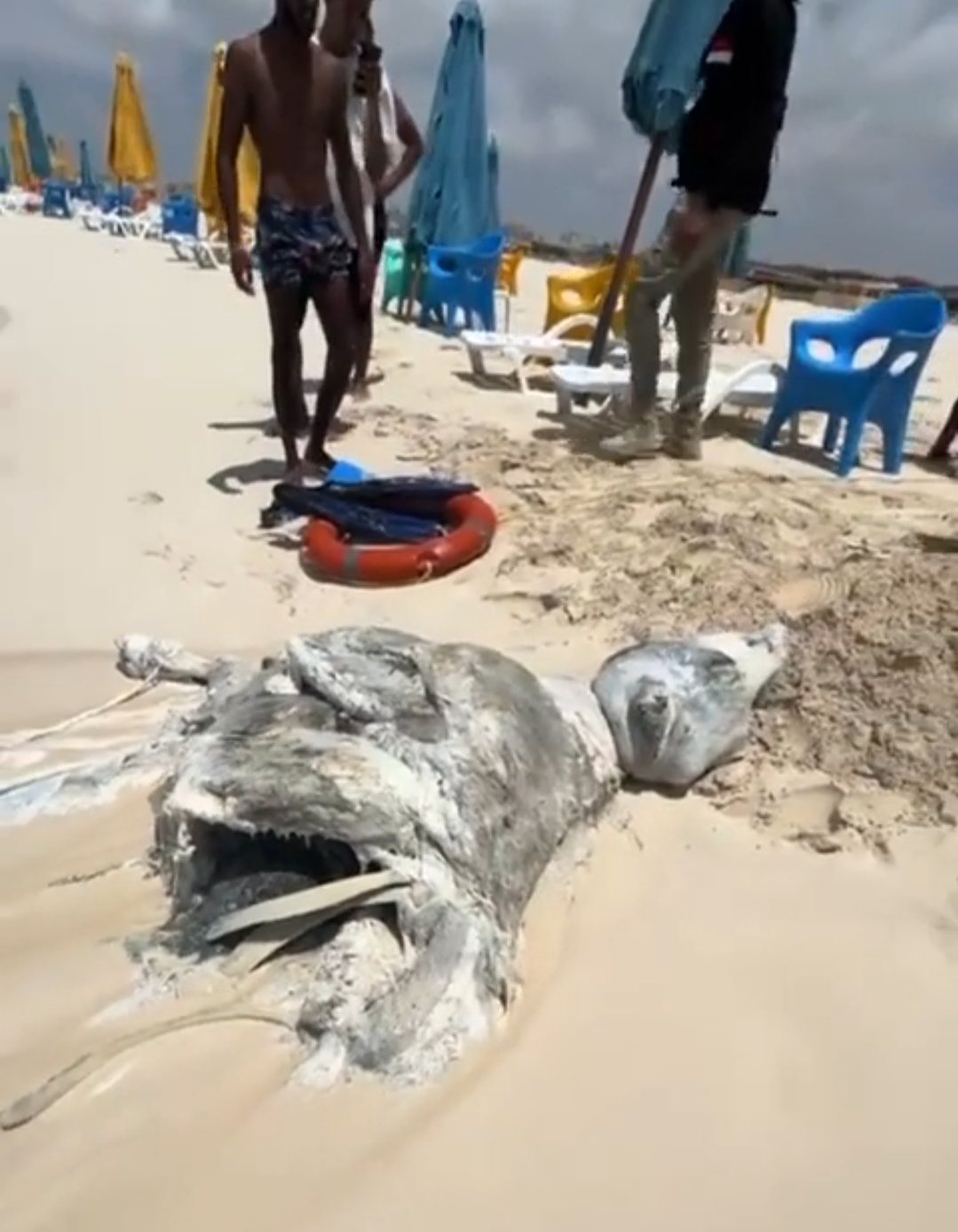 وكان مستخدمو مواقع التواصل الاجتماعي تداولوا صورا للعثور على حيوان نافق يشبه الماشية أو فرس النهر بإحدى شواطئ قرية بالساحل الشمالي، وقالوا إن المصطافين تمكنوا من سحبه وإخراجه لرمال الشاطئ.