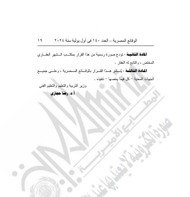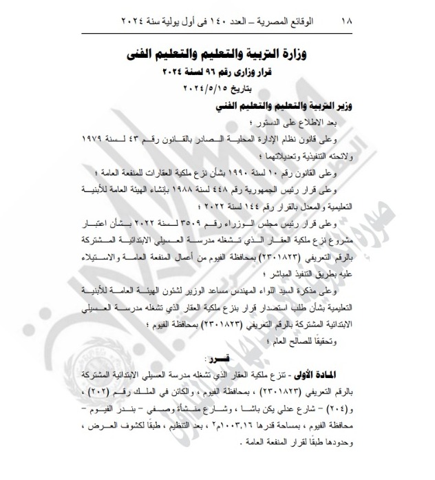 وأضافت الجريدة الرسمية، أن المادة الأولى نصت على نزع ملكية العقار الذي تشغله مدرسة العسيلي الابتدائية المشتركة بالرقم التعريفي 2301823 بالفيوم، والكائن في الملك رقم 202، و204 شارع عدلي يكن باشا، وشارع منشأة وصفي - بندر الفيوم - محافظة الفيوم.