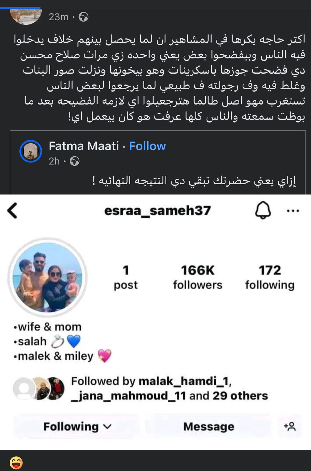 وفي الحقيقة، لم ينشر صلاح محسن أي صور تدل على عودته لزوجته إسراء سامح، وذلك بعد الأزمة التي حدثت بينه وبين زوجته بسبب الشات والتسريبات، والصور المنتشرة بالسوشيال ميديا لا تخص الحساب الرسمي لـ صلاح محسن لاعب النادي المصري.