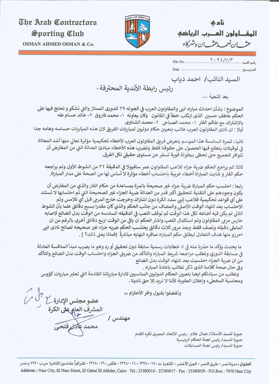 أولًا: نادي المقاولون العرب يطالب بتعيين حكام دوليين لمباريات الفريق لأن هذه المباريات حساسة وهامة جدا.