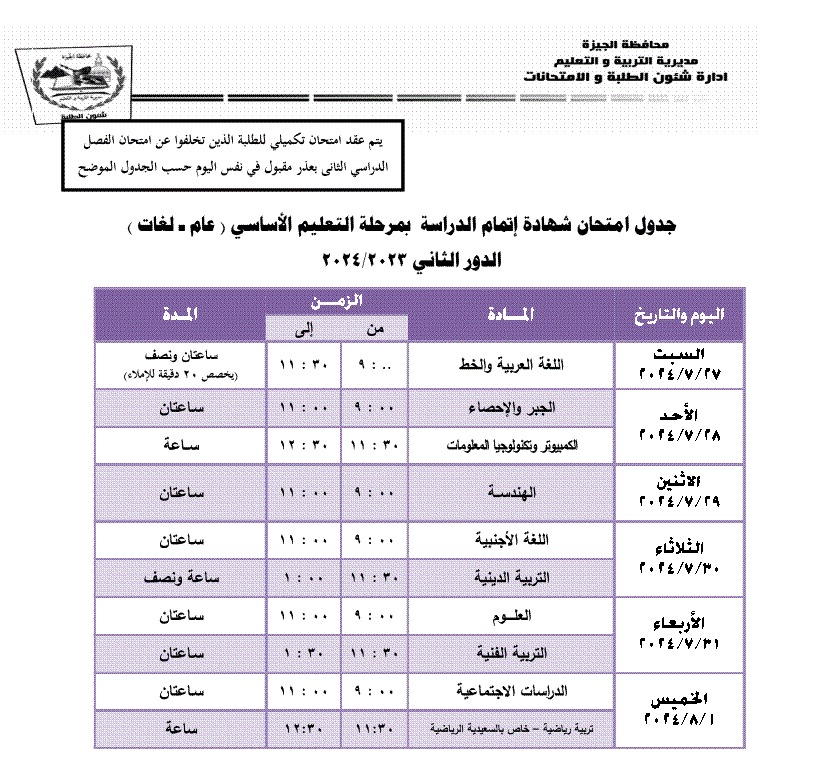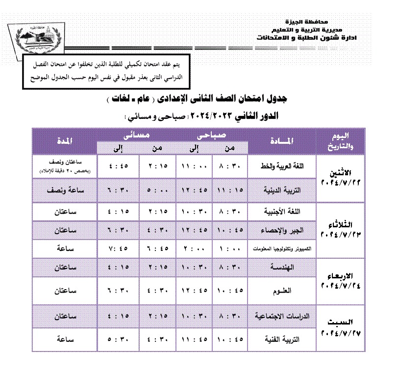 جداول امتحانات الدور الثاني لصفوف النقل الابتدائية والإعدادية والثانوية العام والفني