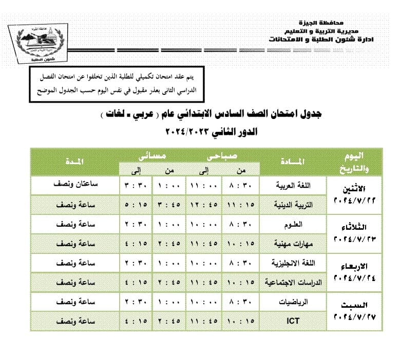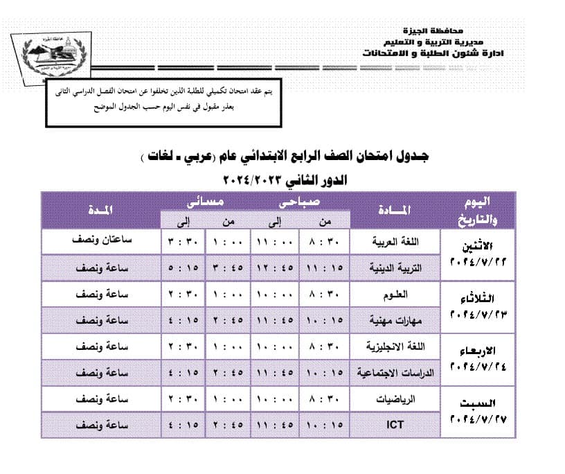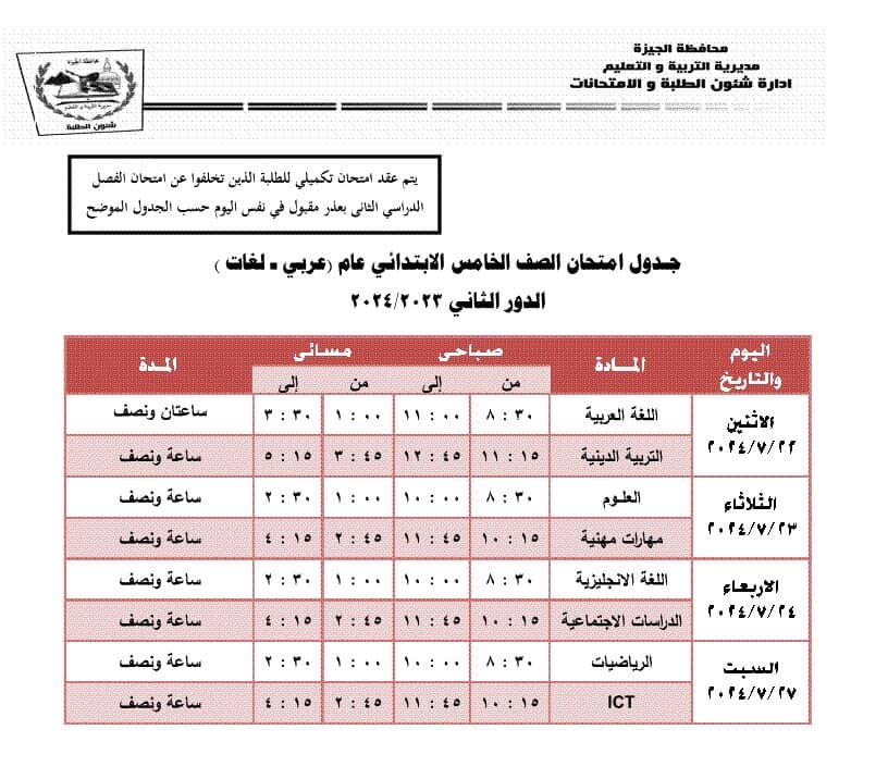 جدول امتحانات الدور الثاني محافظة الجيزة 2024 (المرحلة الابتدائية)