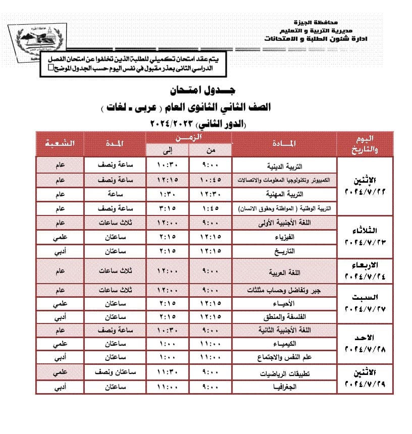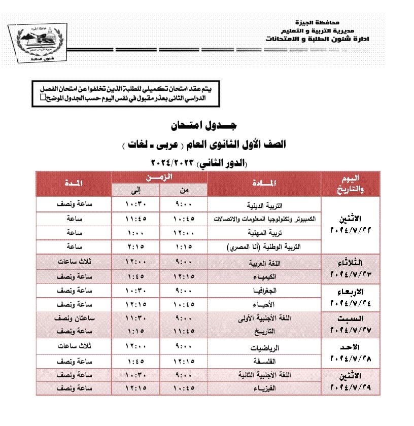جدول امتحانات الدور الثاني محافظة الجيزة (المرحلة الثانوية)