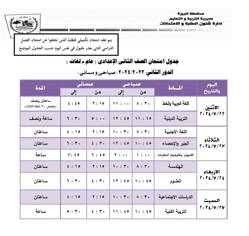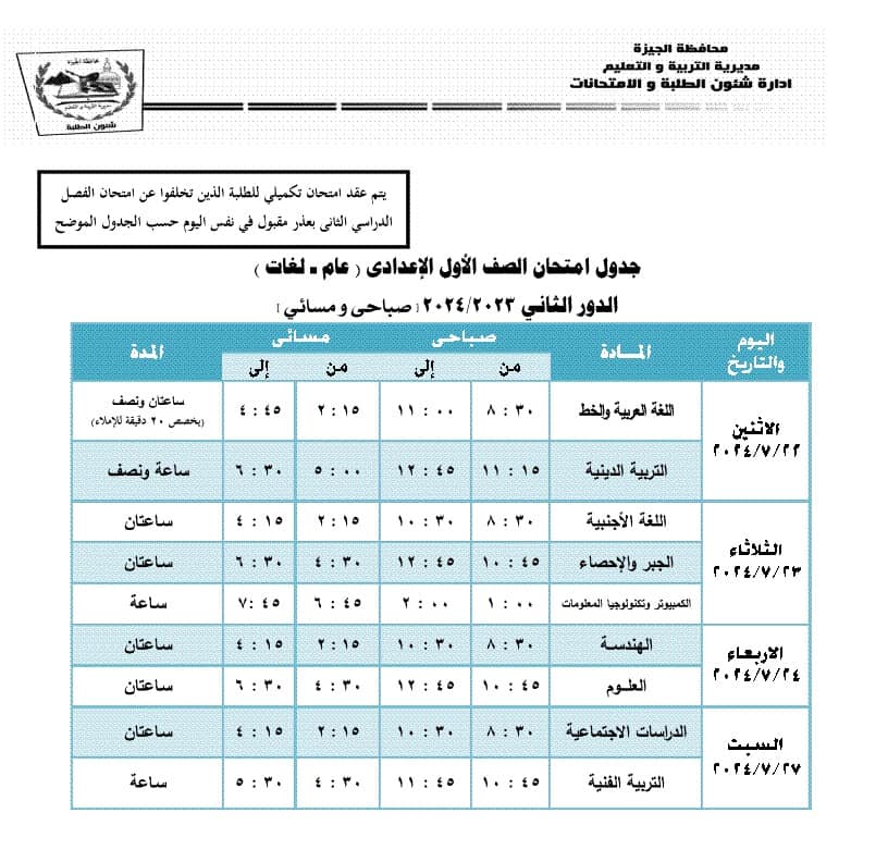 جدول امتحانات الدور الثاني محافظة الجيزة 2024 (المرحلة الإعدادية)