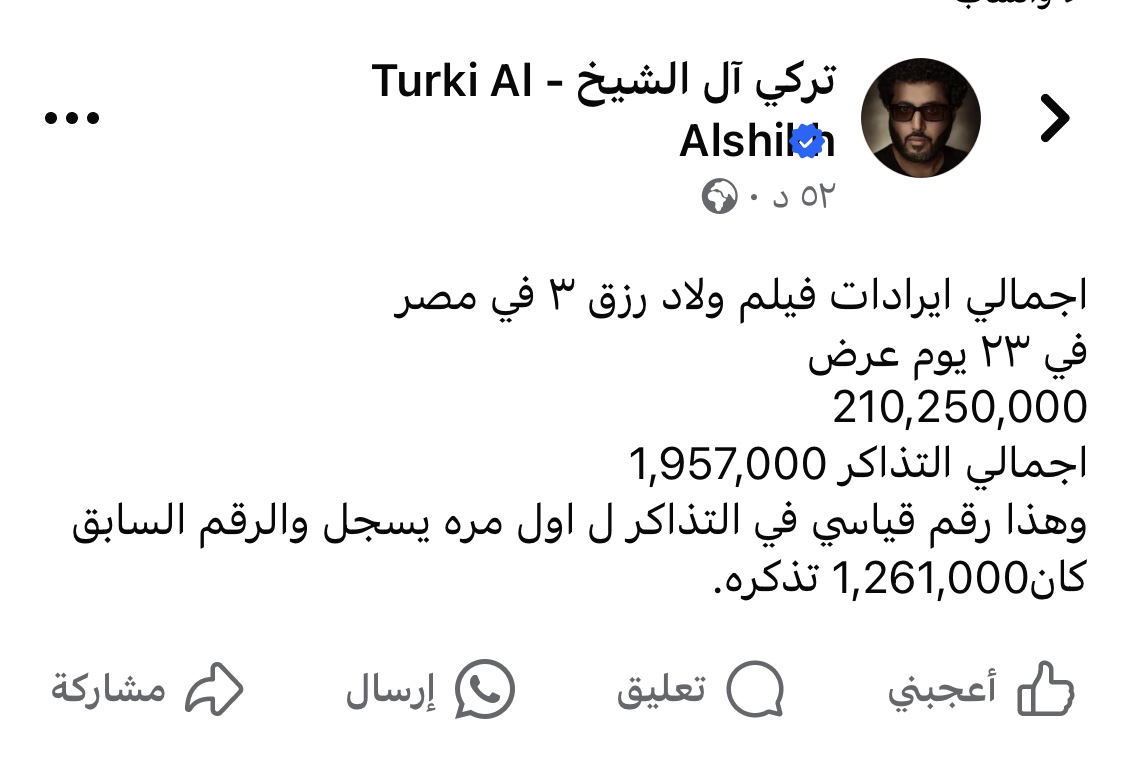 ونشر تركي آل الشيخ عبر حسابه الشخصي بـ موقع التواصل الاجتماعي فيسبوك منشور علق به قائلًا: اجمالي إيرادات فيلم ولاد رزق 3 في مصر في 23 يوم عرض 210،250،000 وإجمالي التذاكر 1،957،000 وهذا رقم قياسي في التذاكر لـ أول مره يسجل والرقم السابق كان1،261،000 تذكره.