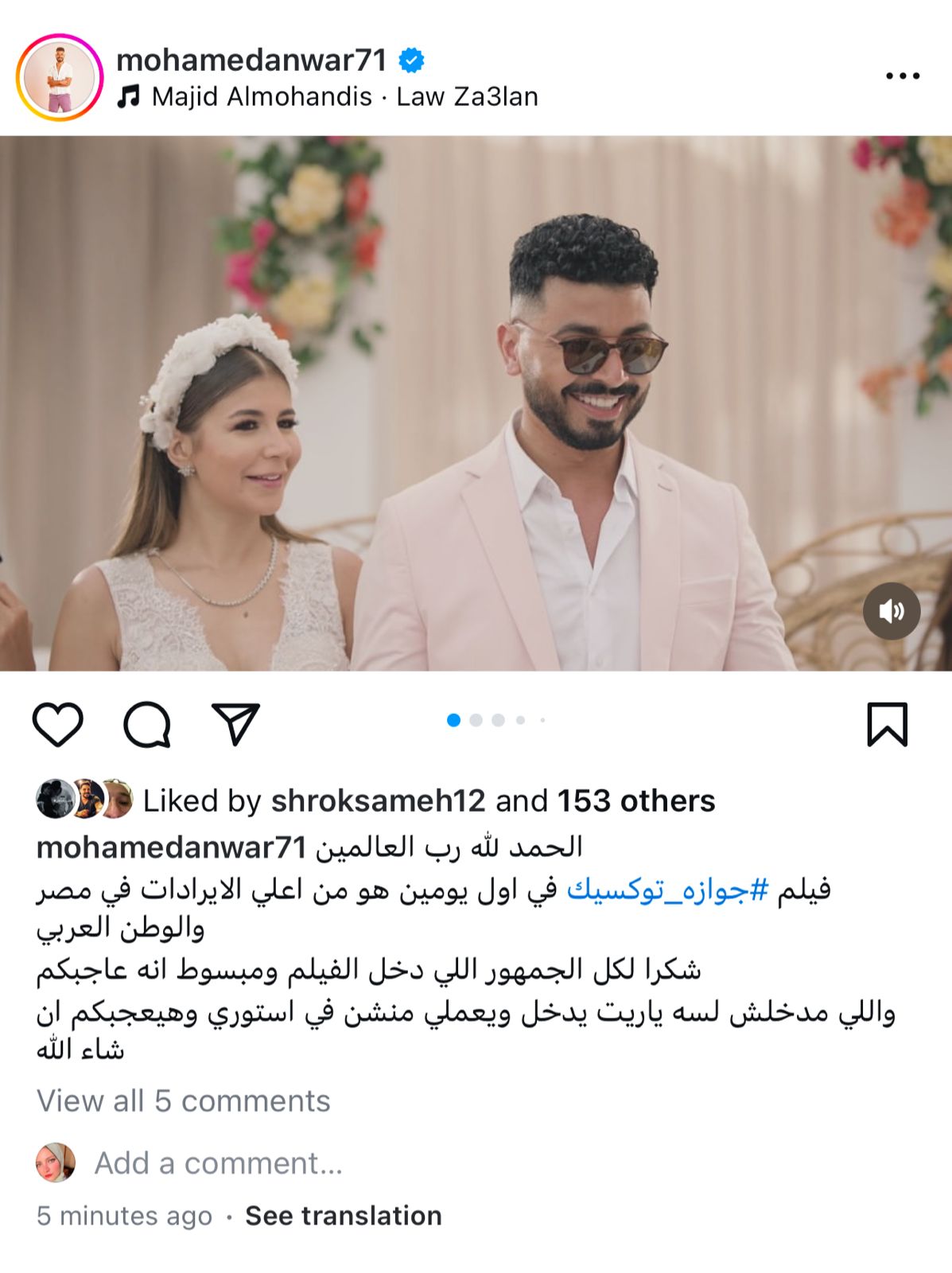 وكتب محمد أنور: الحمد لله رب العالمين، فيلم جوازة توكسيك في أول يومين عرض هو من أعلى إيرادات في مصر والوطن العربي، شكرا لكل الجمهور اللي دخل الفيلم ومبسوط أنه عاجبكم واللي مدخلش لسه ياريت يدخل ويعملي منشن في أستوري وهيجعبكم إن شاء الله.