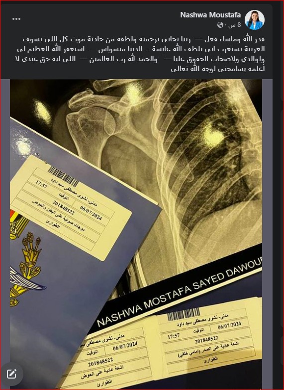 وكتبت الفنانة نشوى مصطفى: قدر الله وماشاء فعل - ربنا نجاني برحمته ولطفه من حادثة موت كل اللي يشوف العربية يستغرب انى بلطف الله عايشة - الدنيا متسواش - استغفر الله العظيم لي ولوالدي ولاصحاب الحقوق عليا - والحمد لله رب العالمين - اللي ليه حق عندى لا أعلمه يسامحنى لوجه الله تعالى.
