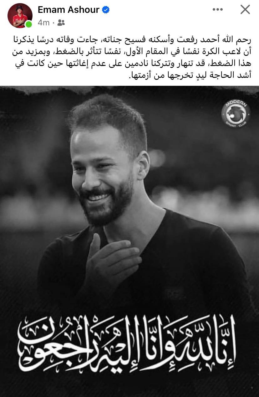 كتب إمام عاشور عبر حسابه الشخصي على فيسبوك: رحم الله أحمد رفعت وأسكنه فسيح جناته، جاءت وفاته درسًا يذكرنا أن لاعب الكرة نفسًا في المقام الأول.