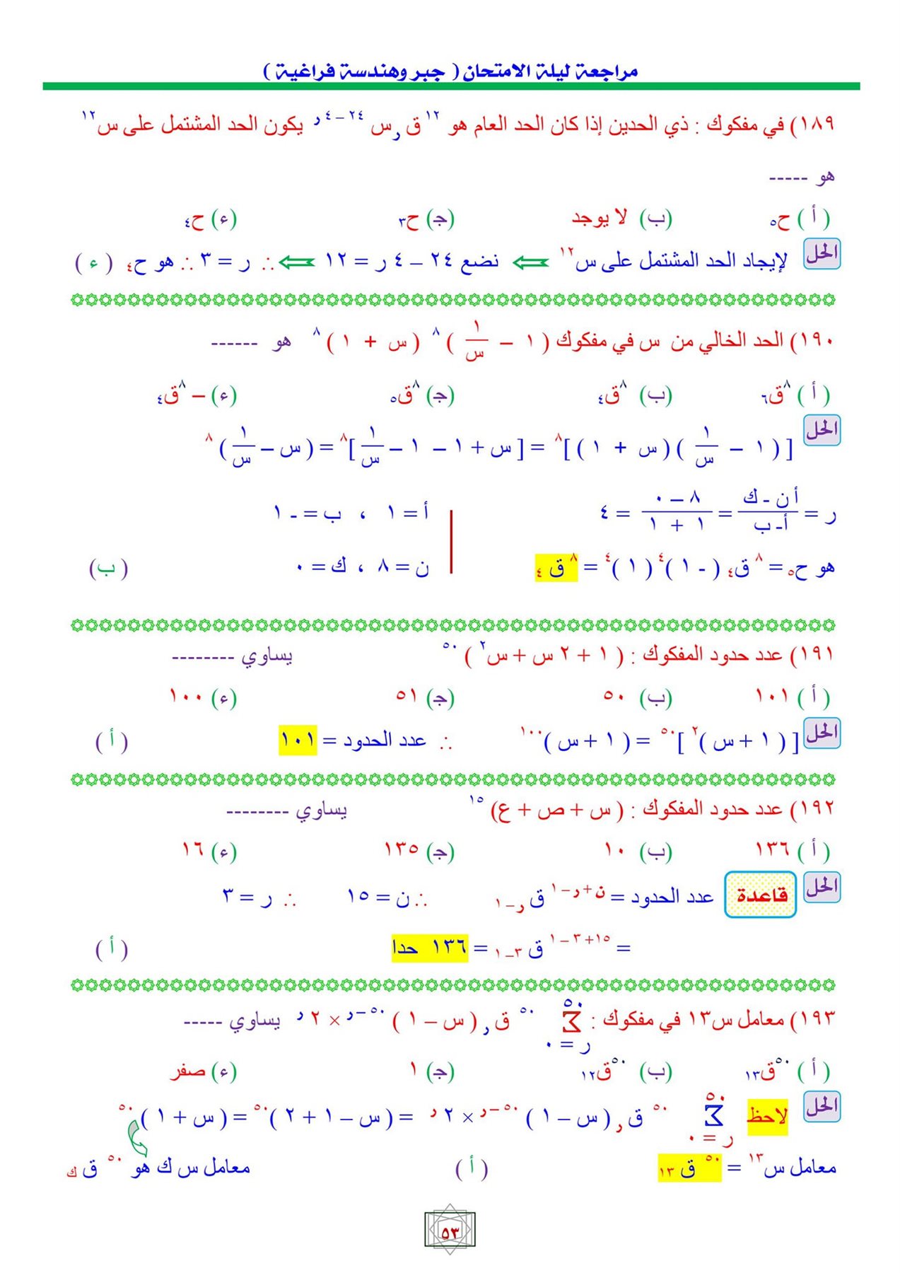 الأسئلة المتوقعة والمراجعة النهائية لمادة الجبر لطلاب الثانوية العامة