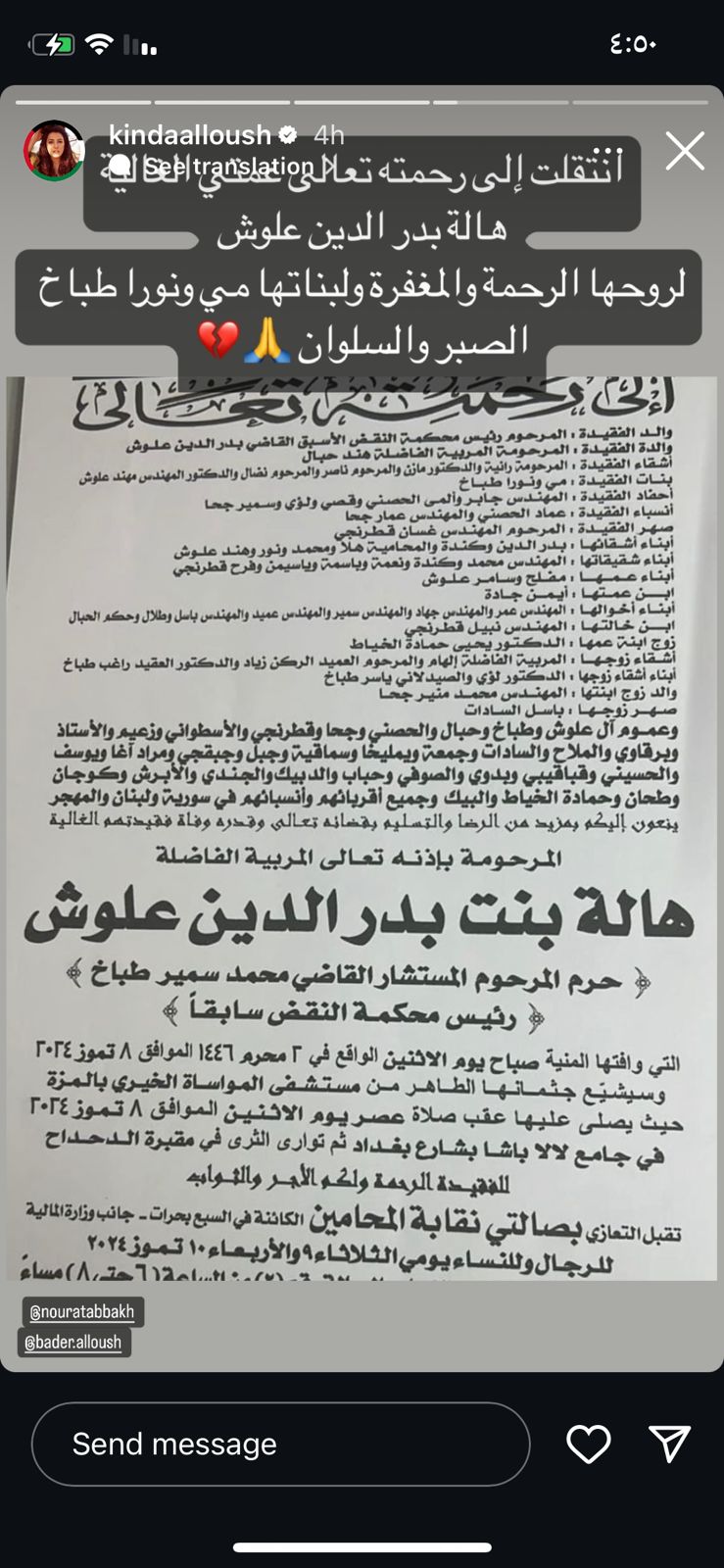 وكتبت كندة علوش عبر حسابها على إنستجرام: انتقلت إلى رحمة الله تعالى عمتي الغالية، هالة بدران الدين علوش، لروحها الرحمة والمغفرة ولبناتها الصبر والسلوان، على أن يقام أخذ العزاء عليها بـ شارع بغداد في دمشق السورية يوم الثلاثاء والأربعاء.