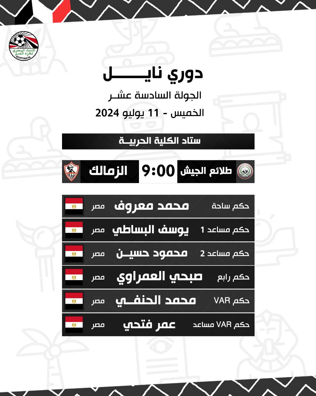 أعلنت لجنة الحكام الرئيسية بالاتحاد المصري لكرة القدم طاقم حكام مباراة الزمالك وطلائع الجيش، والمقرر لها غدا الخميس.