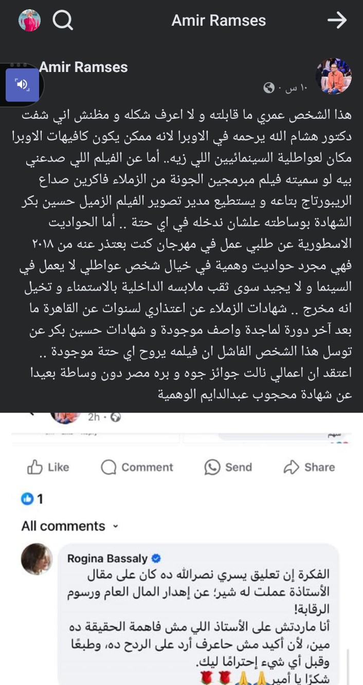 وأضاف أمير رمسيس: شهادات الزملاء عن اعتذاري لسنوات عن القاهرة ما بعد آخر دورة لماجدة واصف موجودة وشهادات حسين بكر عن توسل هذا الشخص الفاشل أن فيلمه يروح أي حتة موجودة، اعتقد ان اعمالي نالت جوائز جوه وبره مصر دون وساطة بعيدا عن شهادة محجوب عبدالدايم الوهمية.