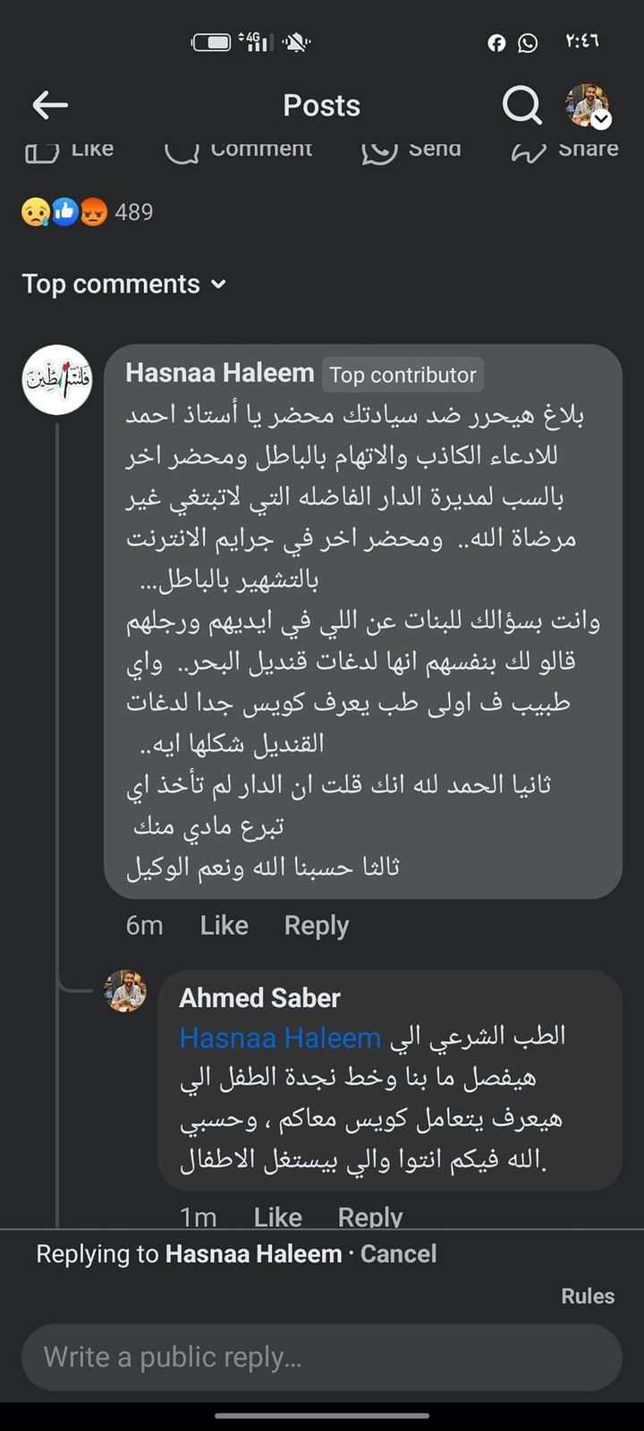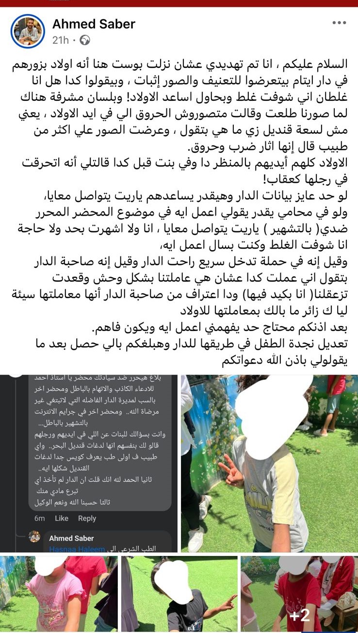 واختتم: انا بحاول أعمل أي حاجة عشان أنقذ الأطفال، ولو أُثبت فعلًا تعرض الأطفال لأي ضرر أنا اللي هعمل محضر وهاخد إجراء قانوني تجاه دار الجيل المؤمن في منطقة الهرم بمحافظة الجيزة، وتجاه تهديدهم ليا بشكل مباشر خلال التعليقات.