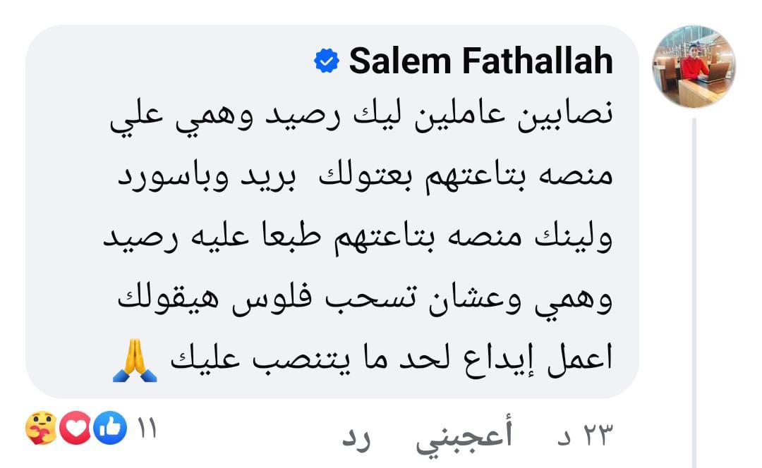 وعلق أحد الأشخاص على منشور بموقع التواصل فيس بوك قائلًا: دول نصابين عاملين ليك رصيد وهمي على منصة بتاعتهم بعتولك بريد وباسورد ولينك منصة بتاعتهم عليه رصيد وهمي، وعشان تسحب فلوس هيقولك إعمل إيداع لحد ما يتنصب عليك.