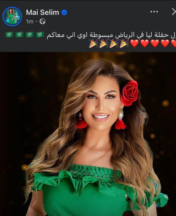 شاركت مي سليم بوستر يحمل صورتها، عبر حسابها الشخصي بموقع فيسبوك، وعلقت عليه قائلة: أول حفل ليا في الرياض مبسوطة أوي إني هكون معاكم.