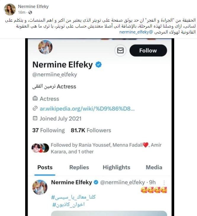 نفت نرمين الفقي وجود أي حساب رسمي لها على منصة أكس، خاصة بعد أن اكتشفت وجود حساب موثق على منصة إكس يحمل اسمها.