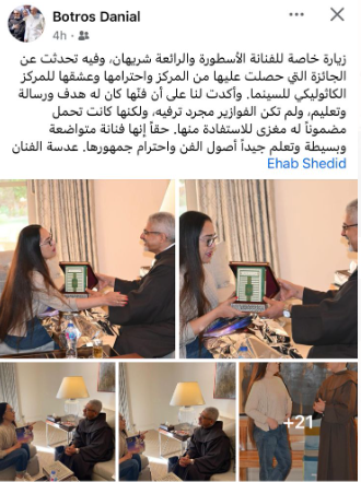 وتحدث الأب بطري دانيال عن كواليس زيارته لـ شيريهان، من خلال منشورًا له عبر حسابه الشخصي بـ فيس بوك، قال فيه: زيارة خاصة للفنانة الأسطورة والرائعة شريهان، وفيه تحدثت عن الجائزة التي حصلت عليها من المركز واحترامها وعشقها للمركز الكاثوليكي للسينما. وأكدت لنا على أن فنها كان له هدف ورسالة وتعليم، ولم تكن الفوازير مجرد ترفيه، ولكنها كانت تحمل مضمونًا له مغزى للاستفادة منها. حقًا إنها فنانة متواضعة وبسيطة وتعلم جيدًا أصول الفن واحترام جمهورها.