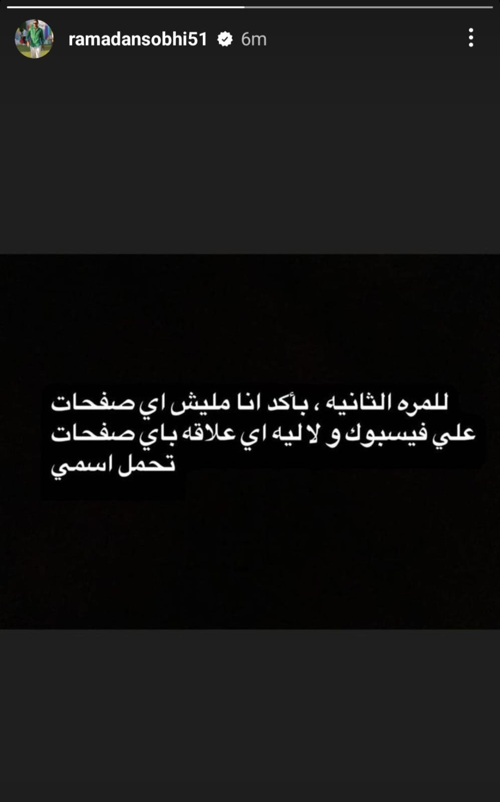 وكتب رمضان صبحي عبر حسابه الرسمي على إنستجرام: للمرة الثانية، بأكد أنا مليش أي صفحات على فيس بوك ولا ليا أي علاقة بأي صفحات تحمل اسمي.
