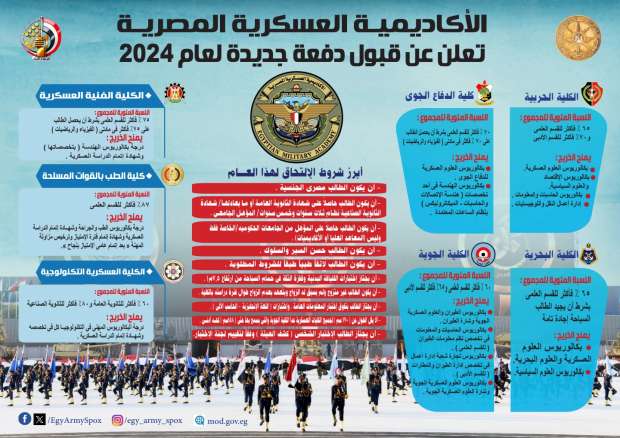 وتضمن الإنفوجراف شروط القبول في الكليات العسكرية والتقديم فيها للكليات الـ 7 كشروط عامة تنطبق على كافة الكليات بالإضافة إلى الشروط الخاصة لكل كلية، وفيما يلي الشروط العامة للقبول في الكليات البحرية والعسكرية 2024: