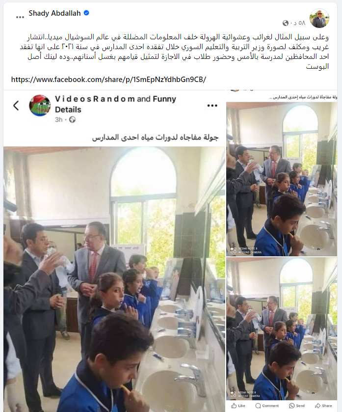 وأوضح شادي زلطة عبر صفحته الشخصية على موقع التواصل الاجتماعي فيس بوك: على سبيل المثال لغرائب وعشوائية الهرولة خلف المعلومات المضللة في عالم السوشيال ميديا.. انتشار غريب ومكثف لصورة وزير التربية والتعليم السوري خلال تفقده إحدى المدارس في سنة 2021 على أنها تفقد أحد المحافظين لمدرسة بالأمس وحضور طلاب في الإجازة لتمثيل قيامهم بغسل أسنانهم.. وده لينك أصل البوست.