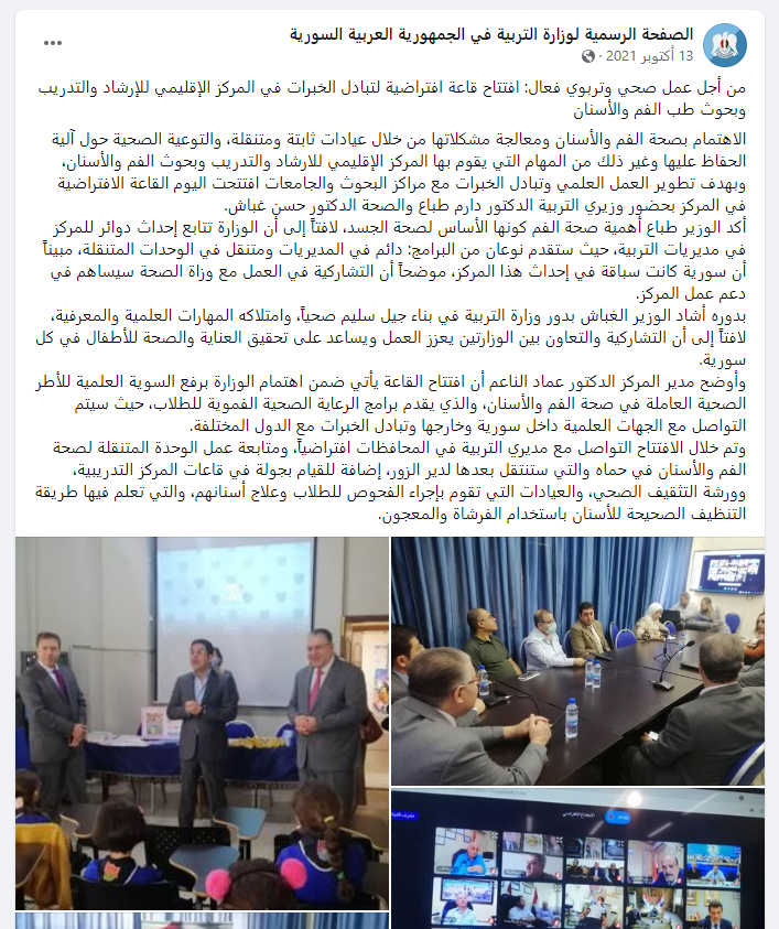 وأرفق متحدث باسم وزارة التربية والتعليم والتعليم الفني منشورًا يعود إلى أكتوبر 2021، لبيان حكومي عن افتتاح وزير التربية والتعليم السوري قاعة افتراضية لتبادل الخبرات في المركز الإقليمي للإرشاد والتدريب وبحوث طب الفم والأسنان.