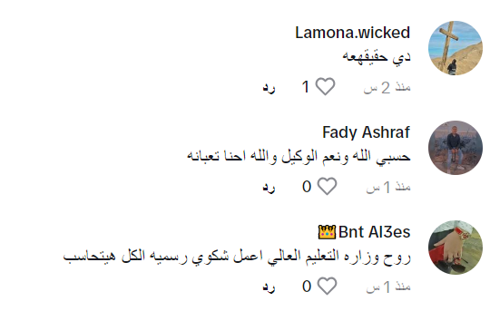 وأثار ذلك غضب كثير من مستخدمي منصة تيكتوك، فيما قالت متابعة: بصراحة المعهد فظيع في أي حاجة فيها فلوس، وآخر: حسبي الله ونعم الوكيل والله إحنا تعبانين.. ومتابع آخر يوصي: روح وزارة التعليم العالي اعمل شكوى رسمية والكل هيتحاسب.